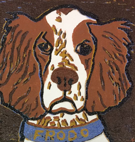 Linosnede van een hond, wordt aan gewerkt tijdens cursus linosnede op woensdag op het atelier van Twan de Vos in Wageningen Linosnede van een hond, wordt aan gewerkt tijdens cursus linosnede op woensdag op het atelier van Twan de Vos in Wageningen Linosnede van een hond, wordt aan gewerkt tijdens cursus linosnede op woensdag op het atelier van Twan de Vos in Wageningen Prachtige linosnede van Frodo, lino in 5 kleuren van een hond