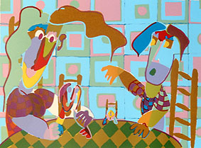 De zeefdruk "Familieberaad" is opgebouwd uit 18 kleuren, er zijn dus 18 zeven gemaakt en afgedrukt.