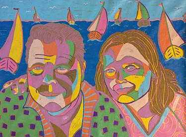 Het portret is een linoleumsnede opgebouwd uit 14 kleuren.