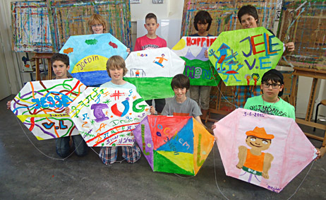De zelfgemaakte vliegers zijn van Tyvek ( mannen in witte pakken materiaal )