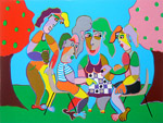 Twan de Vos zeefdruk kunst cobra figuratief familie die op een van de eerste mooie warme zonnige lentedagen naar het strand is gegaan om hier met het hele gezin van te genieten Twan de Vos autopech, de familie past zich aan en verveelt zich niet, zoals het in de jaren zestig ging, flower power Twan de Vos Zeefdruk Smoelslingers, familie die met veel genoegen spaghetti eet, pasta Twan de Vos Zeefdruk Vriendengesprek, drie vrienden die een boeiend gesprek hebben